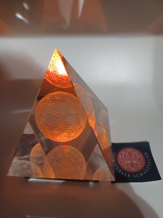 Blume des Lebens Sphärenkristall Pyramide 10 x 10 cm inkl. LED in Geschenkbox