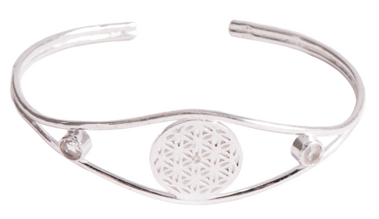 Blume des Lebens Armreif mit weißen Topas offen 925 Silber