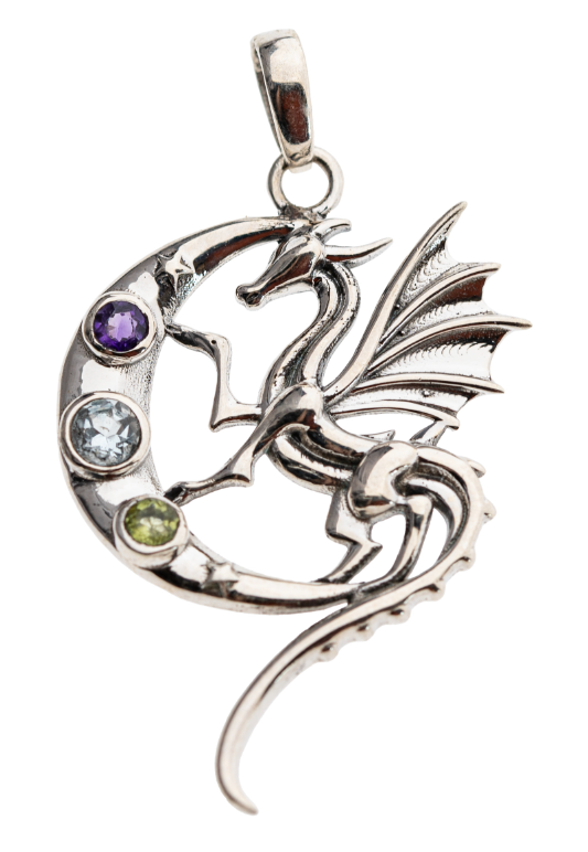 Drache in Mondsichel Anhänger H:40mm 925 Sterling Silber mit Amethyst, Blauer Topaz..