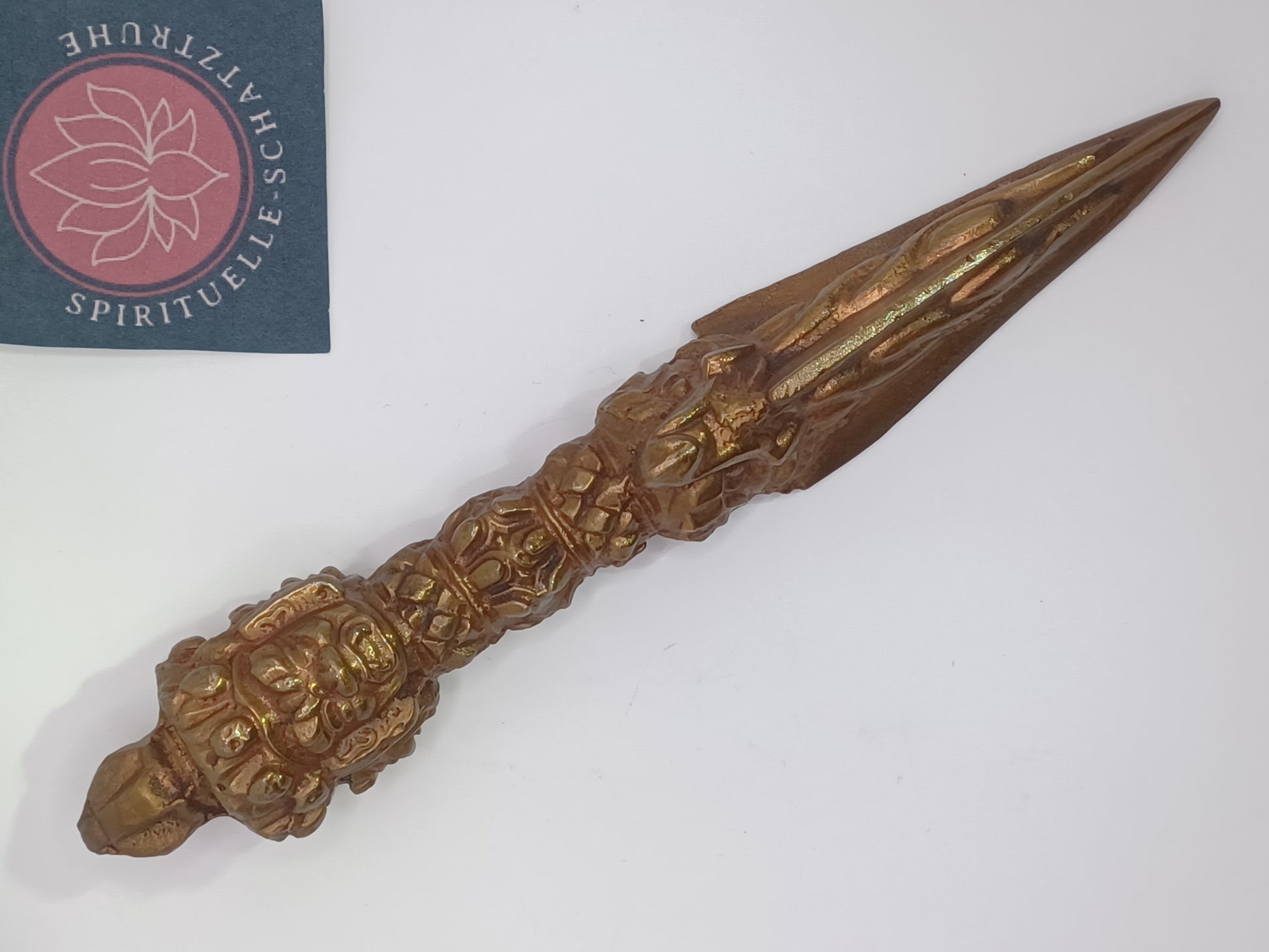 Der Phurba, der auch Dämonendolch genannt wird, ist ein rituelles Instrument, das vorwiegend von tibetischen Buddhisten und nepalesischen Schamanen verwendet wird. Es ist ein kraftvolles Instrument um negative Energien und Dämonen in ihre Schranken zu verweisen.Damit werden sie in untere Reiche verjagt oder sie werden festgenagelt.